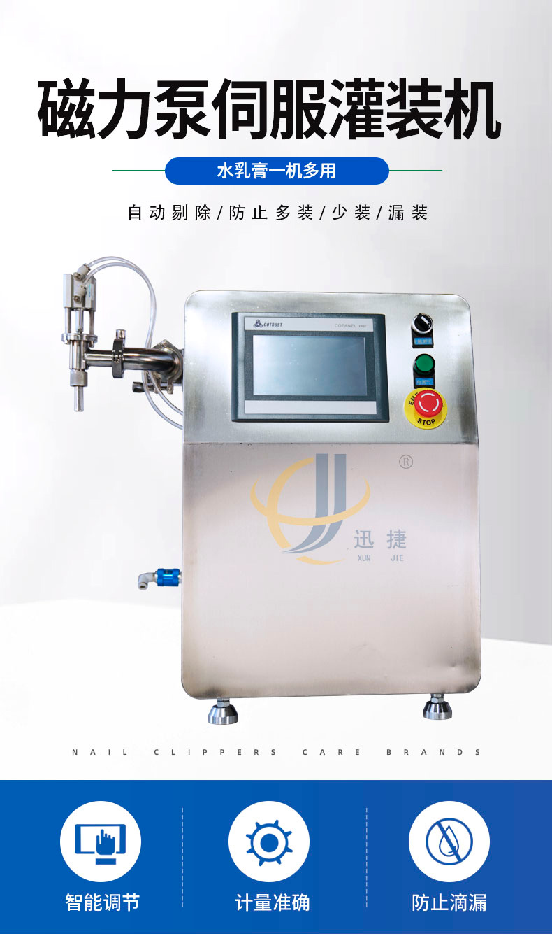 1.本機(jī)采用伺服電機(jī)驅(qū)動,PLC和觸摸屏控制,316L材質(zhì)齒輪泵灌裝原理,適合日化、醫(yī)藥、食品、油脂等各類流體和半流體物料定量灌裝。2.灌裝量通過觸摸屏調(diào)節(jié),灌裝量調(diào)節(jié)無上限,泵頭易拆裝易清洗,非常適合產(chǎn)品種類多,需要經(jīng)常調(diào)節(jié)范圍的用戶。3.計(jì)量準(zhǔn)確,灌裝100ML,可以實(shí)現(xiàn)不大于0.5ML的誤差。