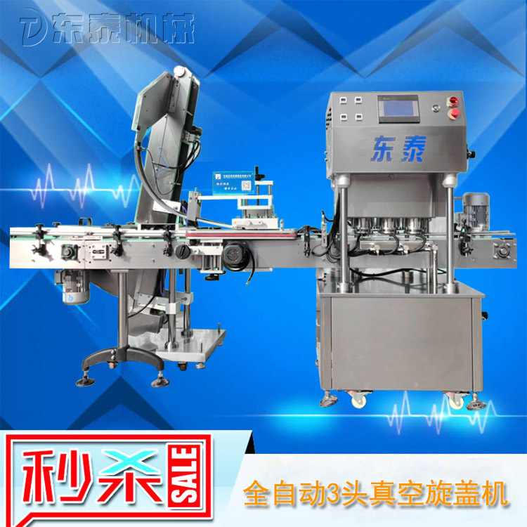 該直線式真空旋蓋機(jī)是東泰機(jī)械結(jié)合用戶使用情況,摒棄了傳統(tǒng)轉(zhuǎn)盤式真空旋蓋機(jī)的弊端,研制開發(fā)的新型高效設(shè)備,設(shè)備自動(dòng)檢測到兩個(gè)瓶子蓋子進(jìn)入到雙頭真空旋蓋機(jī)內(nèi),旋蓋機(jī)彩色顯示屏?xí)?shí)時(shí)顯示旋蓋狀況,整機(jī)多點(diǎn)檢測,當(dāng)進(jìn)口無瓶無蓋、出口堵塞、定位不準(zhǔn)、瓶身傾倒均自動(dòng)停機(jī)。單個(gè)旋蓋頭達(dá)到的真空度都可以單顯示,單調(diào)整。產(chǎn)品技術(shù)參數(shù)