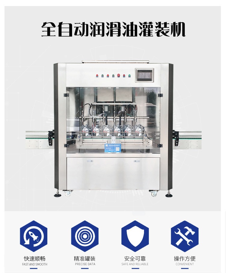 該六頭柱塞式全自動潤滑油灌裝機特的灌裝頭設(shè)計及真空回吸系統(tǒng),確保灌裝過程無殘油滴漏,快慢雙速灌裝,灌裝速度可調(diào),杜絕溢瓶現(xiàn)象。該機采用動力灌裝,無需配裝高位罐,簡化了安裝工序,提高了灌裝效率。履帶式壓蓋機,穩(wěn)定無噪音,無空壓現(xiàn)象。觸摸屏界面友好,操作簡捷,SIEMENS PLC控制系統(tǒng),運算速度快,性能穩(wěn)定,品質(zhì)卓越。電、氣件均采用精品元件,確保整機運作穩(wěn)定。