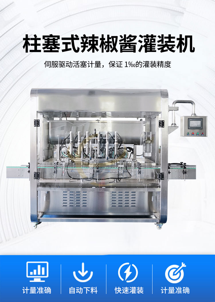 辣椒醬灌裝機采用活塞式灌裝原理,適用于調(diào)味品中帶顆粒并且濃度較大的辣椒醬、豆瓣醬、花生醬、香菇醬、果醬、牛油火鍋底料。